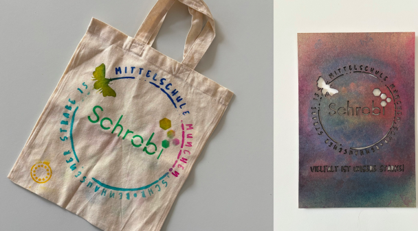 In Zusammenarbeit mit dem FabLab haben wir für unsere Schule eine tolle Schablone mit unserem Schulloge erhalten. Vielen Dank für eure Hilfe! Damit können wir nun an unseren Schulfesten den Workshop "Pimp my Bag" anbieten, der viel Freude bereitet.