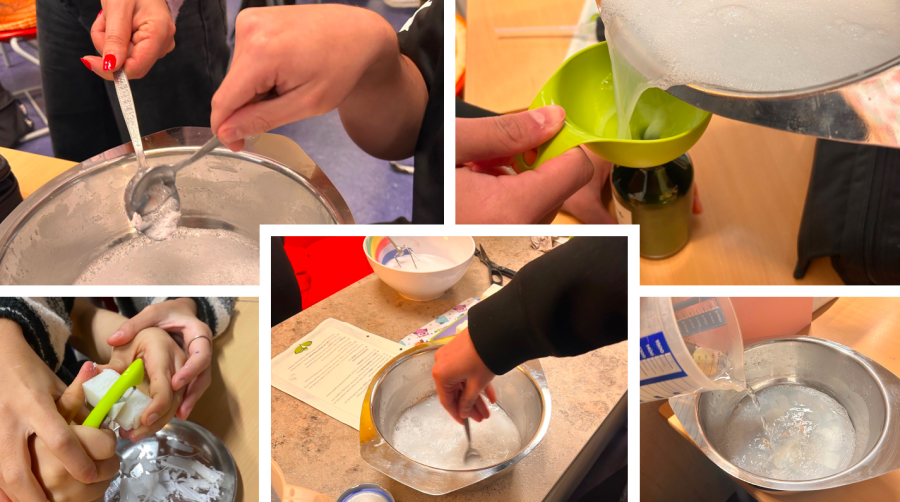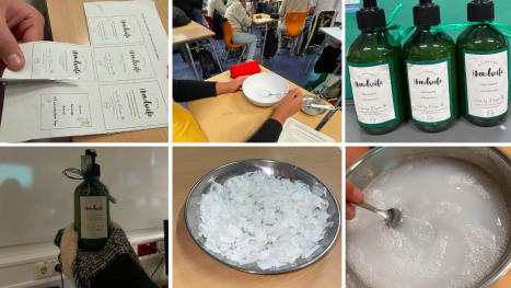 Zwei Workshops liefen unter dem Namen "Clean and Green - Wir machen Schule sauber!". Hierbei haben die Jugendlichen sich über die Vorteile von selbthergestellter Seife informiert und danach eigenständig Flüssigseife aus einfachen, natürlichen Zutaten angefertigt. Allein mit Wasser, geraspelter Kernseife und Kokosöl konnte das Produkt innerhalb eines Schultages hergestellt werden. Abgefüllt in den Pumpsendern, wurden diese mit zuvor gestalteten Etiketten beklebt und in Szene gesetzt. Nach der praktischen Durchführung erstellten die Schülerinnen und Schüler Vorträge, die sie bei der Präsentation des Produkts in den anderen Klassenzimmern einsetzen werden. Zudem wurden Allzweckreiniger hergestellt, die ebenso an alle Klassen am Anschluss verteilt werden. Mit ihrer natürlichen Kraft können diese nun die Klassenzimmer und auch Hände sauber halten.